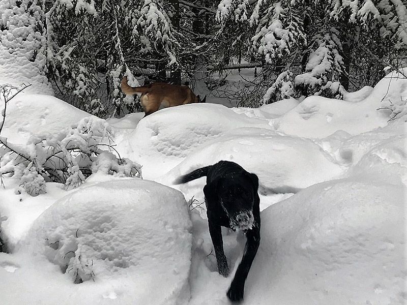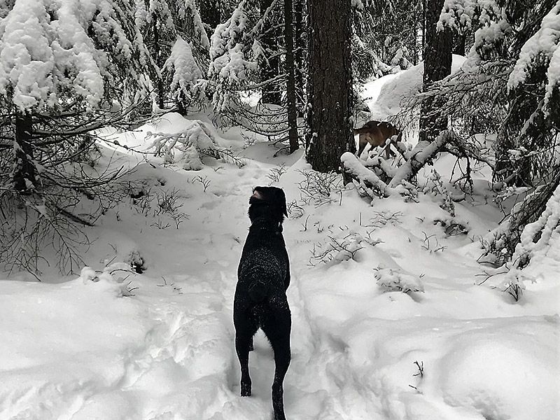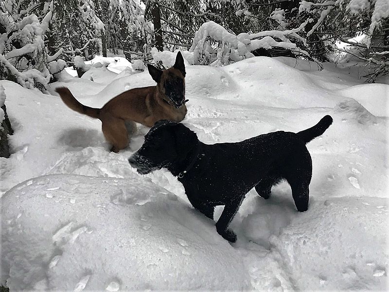 Vi är helt förutsägningsbara. Inne i skogen och i brist på väg blir det tvärt om. Det finns så många stenar att hoppa upp på och stammar att balansera över. Balansera tillsammans. Skogen är en enda stor hinderbana! Uppmuntra din hund att kliva upp på allt. Häng med din hund. Titta på den. Vad är det den upptäcker och blir intresserad av. En gren? Gräv ned den och under tiden den är upptagen med att gräva fram den, gå iväg och göm dig.